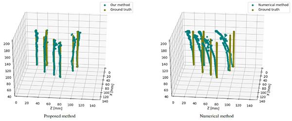image: Captured motion sequences with marker orientation kept vertical to the flux sensor plane and computed with the proposed method and numerical method. The traditional method has a certain bias while the proposed deep-learning approach solves the problem to achieve higher accuracy.