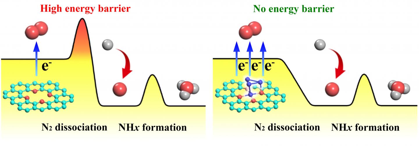 image: Schematic illustration of altering the rate-determining step of nitrogen reduction reaction by introducing cobalt single-cluster in the catalyst. The cyan, red, purple, and gray spheres represent C, N, Co, and H atoms, respectively.