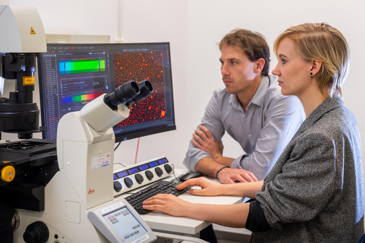 image: Prof. Job Boekhoven and Caren Wanzke at the Technical University of Munich discovered a new material system that can release drugs with a constant release rate over a tunable period of time. The microscopic image (right screen) shows droplets of the hydrolyzable oil embedded in a hydrogel.