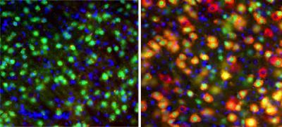 Neurons from the thalamus of control mice with healthy genes glow green (left), while those whose two Tsc1 alleles were deleted during embryonic development show a strong red glow (right), indicating disruption of the mTOR pathway that regulates growth.