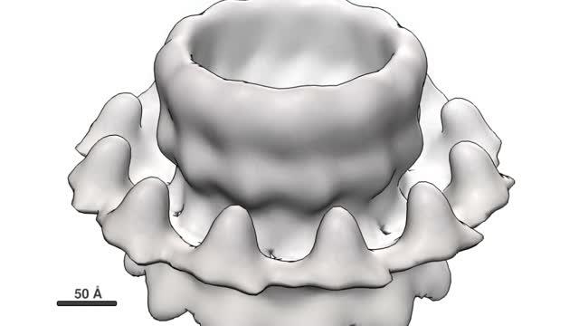 video: The replication crown complex is imaged with approximately fourfold increase in resolution from prior imaging, revealing details of the three major subdomains at a resolution of approximately 8.5 angstroms, which corresponds to the spacing of a few atoms.