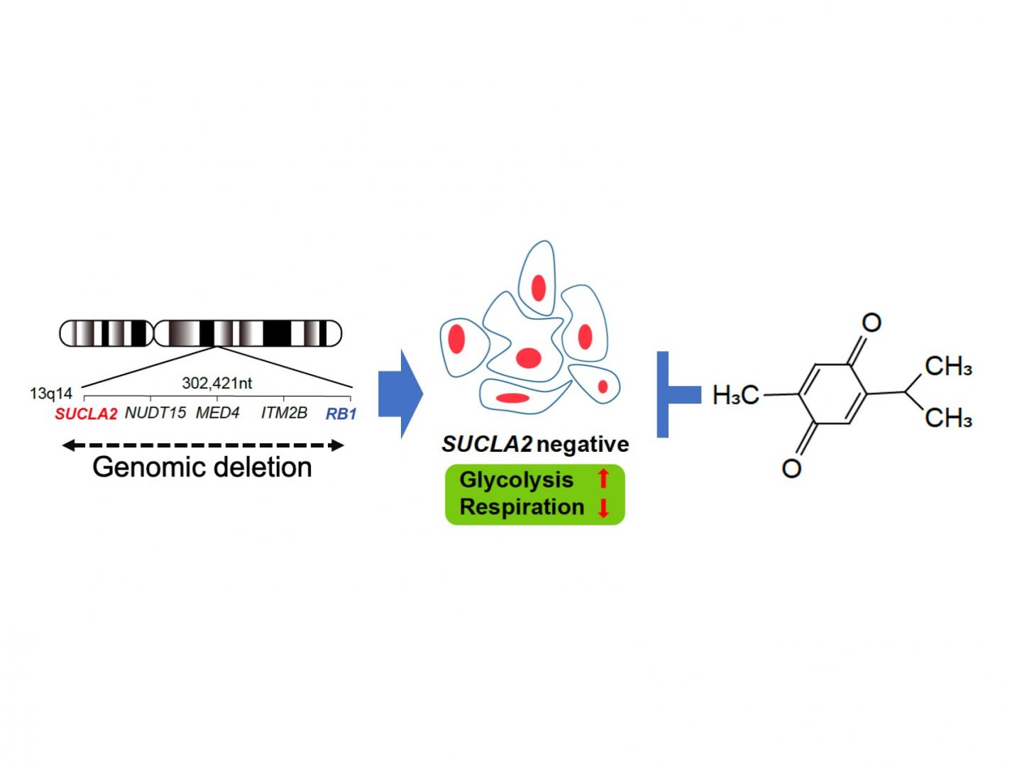 image: SUCLA2 gene is frequently involved in the deletion of RB1 gene region, which occurs in 10 - 30 % of advanced prostate cancers. SUCLA2 deletion gives rise to a metabolic vulnerability. By screening chemical compounds, thymoquinone appeared to selectively kill SUCLA2-deficeint prostate cancer cells.