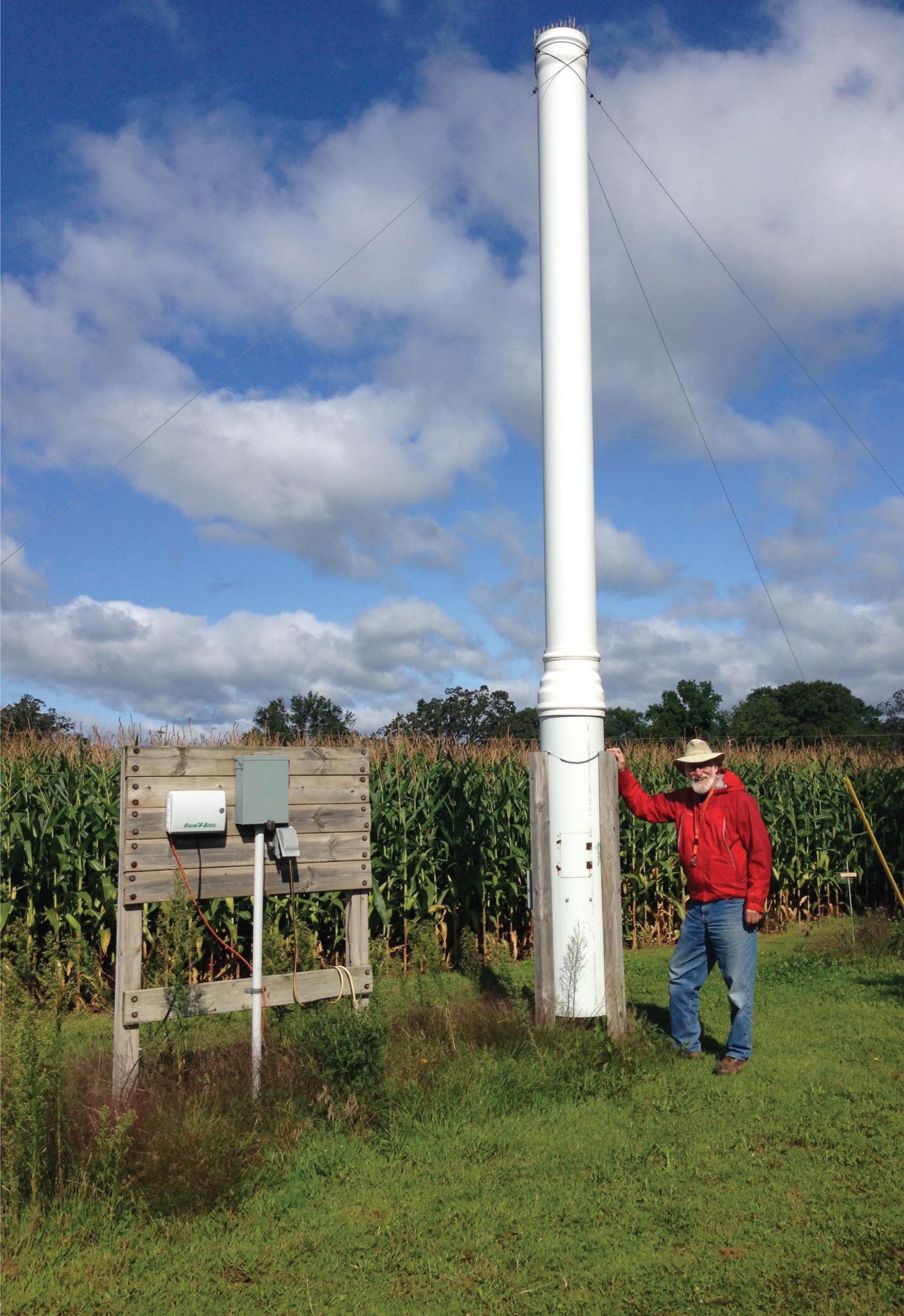 image: David Voegtlin of the Illinois Natural History Survey poses with one of the suction traps in Wisconsin. The Midwestern network of traps has revealed a wider picture of life in the skies.