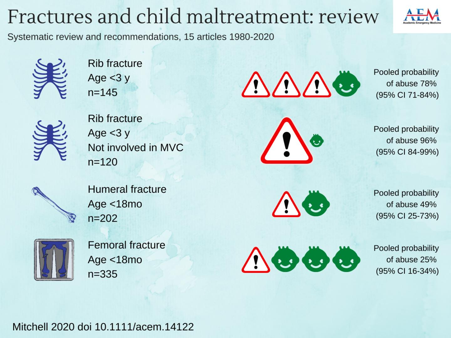 "Undiagnosed child abuse can lead to subsequent serious injury or death, and understanding injury characteristics that can predict increased risk of an abusive injury is critical. This systematic review identified rib fractures in children younger than three years old and humeral or femoral fractures in children younger than 18 months old, and without an independently verified injury mechanism, as higher risk for abuse. For these patients, the authors recommend diagnostic evaluation and consultation for potential abuse in order to minimize morbidity and mortality from these intentional injuries."