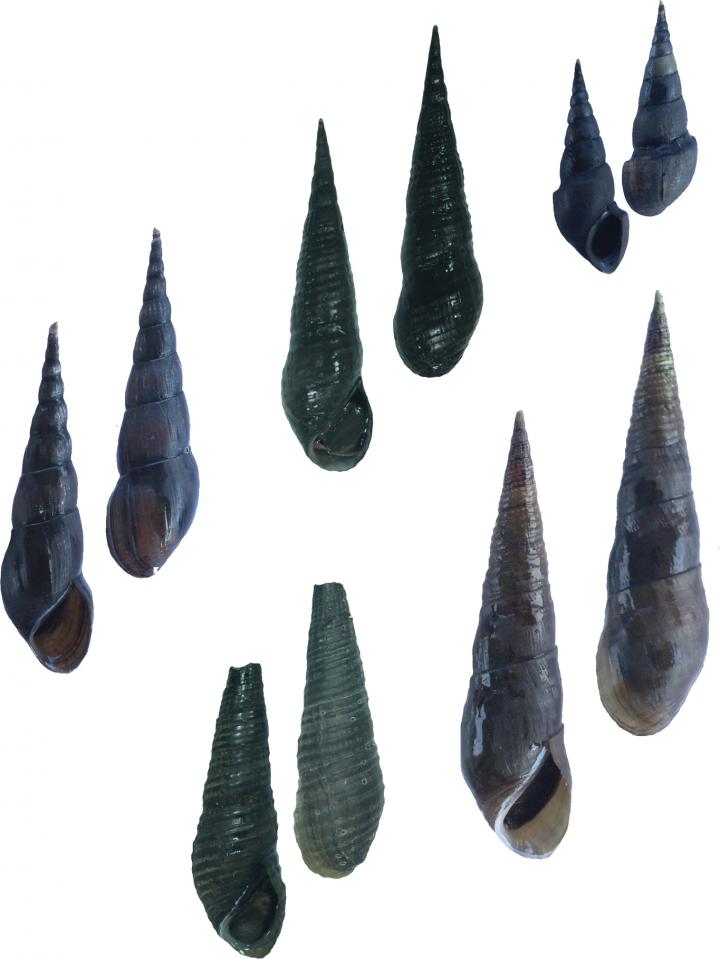 image: Shells of the studied thiarid snails (genus Stenomelania) found in Thailand.