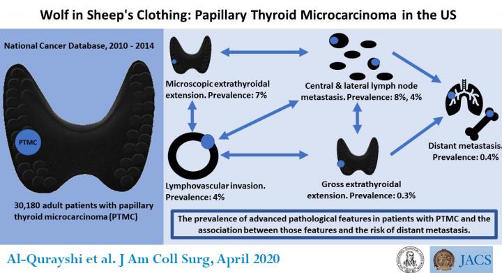 CHICAGO (March 6, 2020): Although papillary thyroid carcinoma is the most common form of thyroid malignancy, it is considered to be an indolent disease that progresses slowly and has an excellent prognosis. Patients, therefore, may be monitored on a regular basis rather than undergo a surgical procedure at the outset. But results from a new large-scale study show that in nearly 20 percent of patients, papillary thyroid tumors less than 1 cm in size had pathological signs of more aggressive disease that increased the risk that these patients might develop distant metastasis (spread of the disease to other areas of the body away from the primary site of cancer). The study demonstrates the need for developing sophisticated tests that will find patients with these pathological signs early on and for them to be counseled on all treatment options, including immediate surgical removal of part or all of the thyroid gland. The research study appears in an "article in press" on the Journal of the American College of Surgeons website in advance of print.