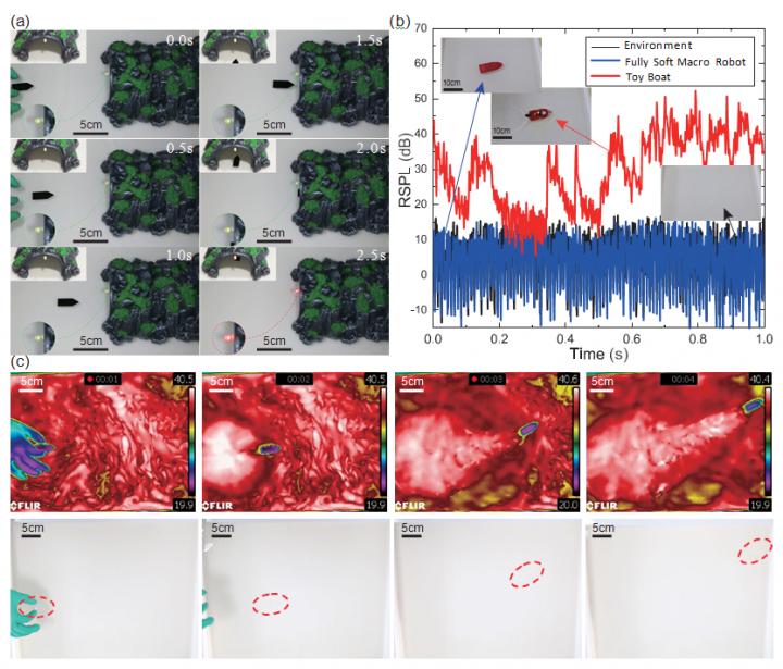 image: (a) Photographs of a robot targeting an LED-indicated path. The targeting demonstration shows the accuracy that the robot control can achieve. (b) Comparison of the measured relative noise level of a soft macro robot and a battery-powered, similarly sized toy boat. RSPL denotes to the relative sound pressure level. The robot exhibits a much lower noise level compared to the toy boat. (c) Photographs of a cold robot moving in warm water taken by an infrared video camera and a normal camera, respectively.