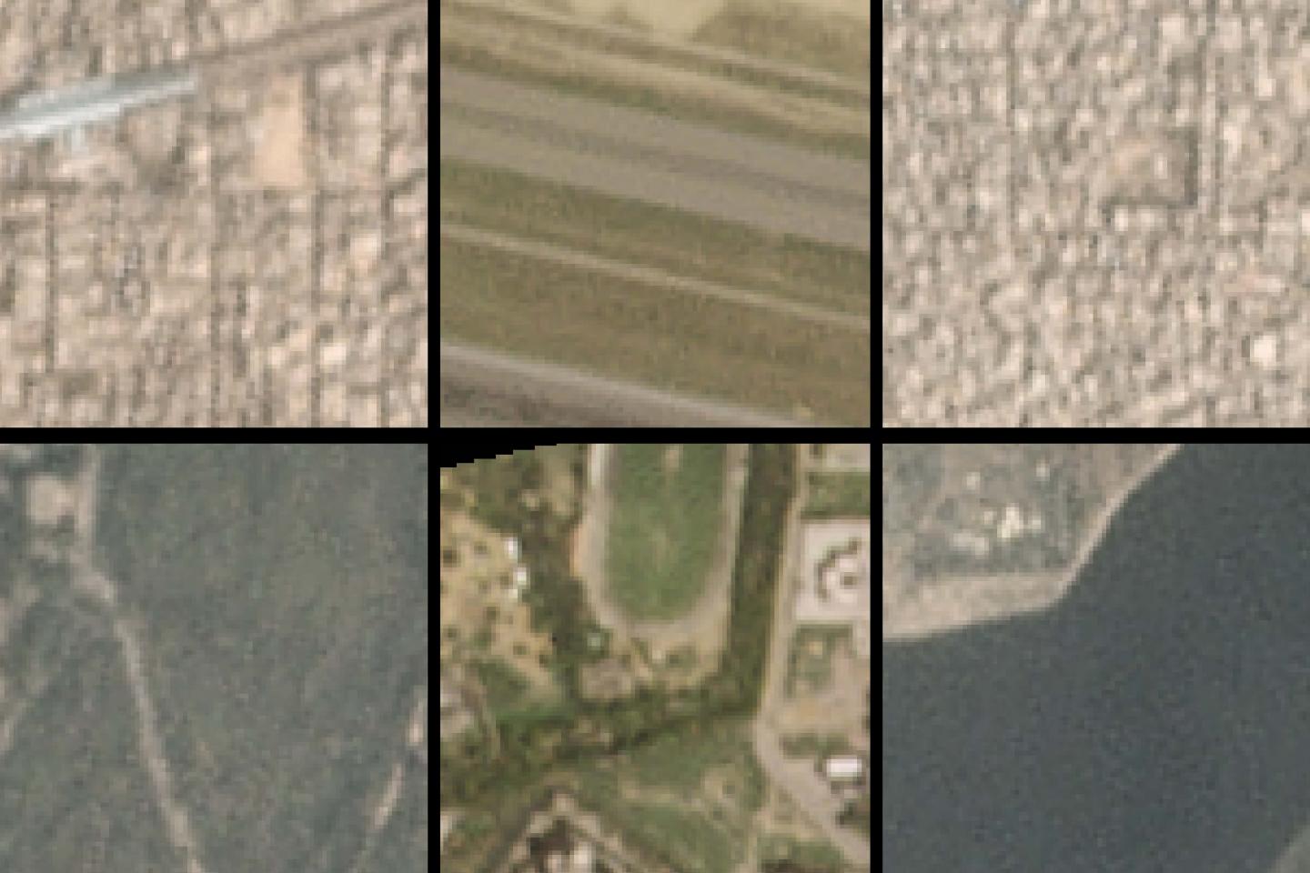 image: A new AI algorithm picked out these city-block-sized satellite images as local hotspots (top) and cool spots (bottom) for air pollution in Beijing.