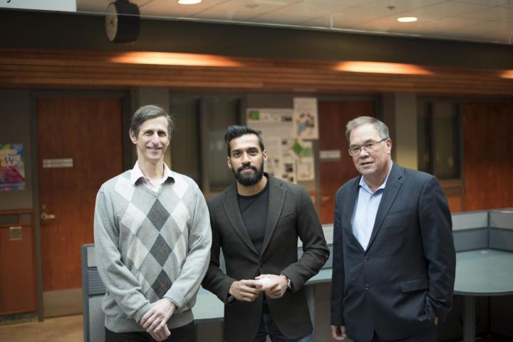 image: Sunil Kalmady Vasu (centre) led a recent study with fellow U of A researchers including Russ Greiner (left), Andrew Greenshaw (right) and Serdar Dursun (not pictured), showing that a machine learning tool could help predict early symptoms of schizophrenia in siblings and children of patients, potentially leading to earlier diagnosis and treatment.