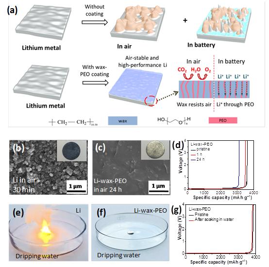 In the electronics field, the packaging technology protects electronic components from the physical damage and the corrosion in humid air and water by a coating, which provides a design thought for the protection of lithium metal. Recently, a research team led by Prof. Quan-Hong Yang in Tianjin University and Prof. Wei Lv in Tsinghua University developed a wax-PEO coating on lithium metal surface by a simple dip coating method to realize an air-stable and waterproof lithium metal anode. Wax as a commonly-used inert sealing material is easily coated on the surface of lithium metal. The obtained wax-based composite coating prevents the adverse reactions of lithium metal in the air and water. In batteries, the coating retards the etching of electrolyte to the surface of lithium metal anodes while the homogeneously distributed PEO guarantees the uniform lithium ion conduction at the interface and inhibits the growth of lithium dendrites.