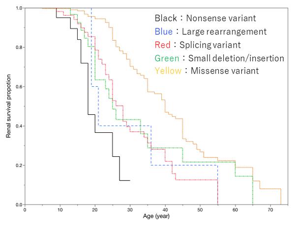2. There was a very strong correlational relationship between genotype and the median age for progression to ESKD. The median age was 18 for those with nonsense mutations (Figure 1: black survival curve), whereas it was 40 in those with missense mutations (Figure 1: yellow survival curve). This is a difference of 22 years (Figure 1).