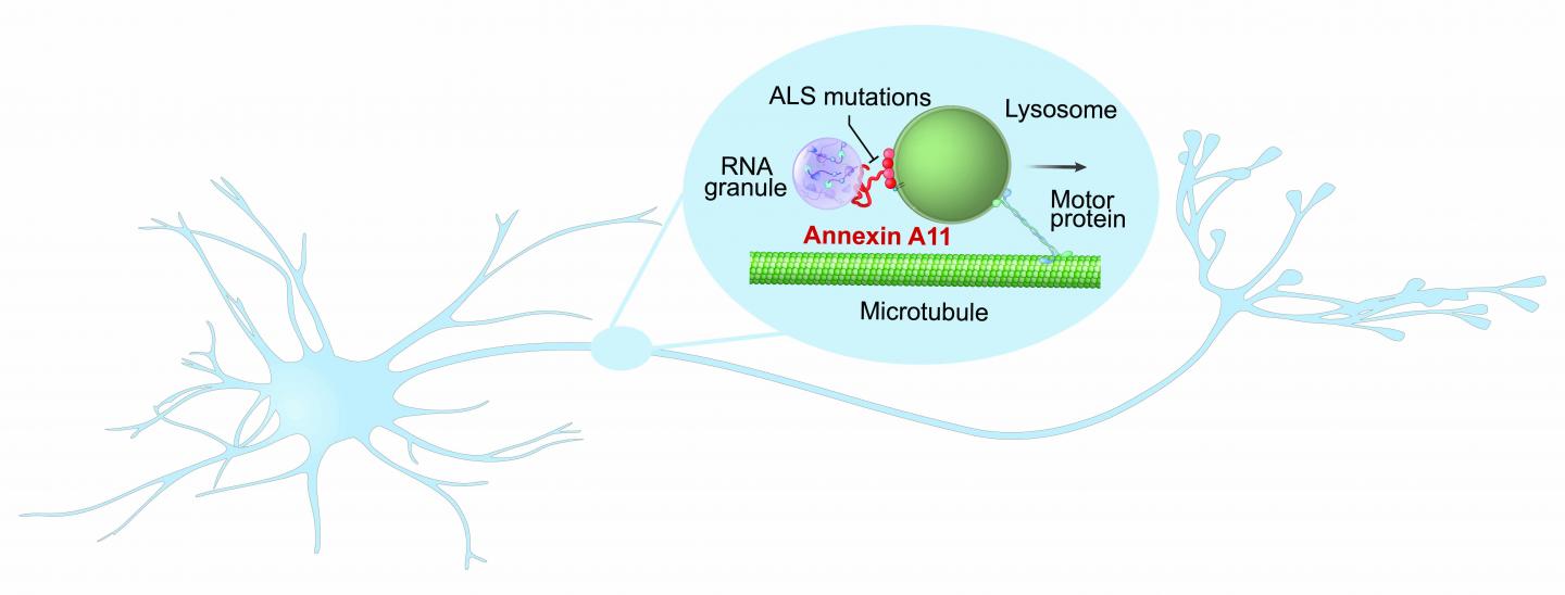 Neurons, like other cells, constantly manufacture proteins, the cell's workhorses. Instructions for making proteins are encoded in chromosomal DNA and stored in the nucleus. Manufacturing starts when DNA instructions are transcribed into RNAs, which are packaged as granules and transported out of the nucleus to other parts of the cell for assembly. Unlike in other cells, RNA in neurons may have to travel over great distances - sometimes up to four feet - down stringy axons or through dendritic branches. Using advanced live cell microscopy, the researchers found that annexin A11 plays a role in this process by helping RNA granules hitch rides onto traveling lysosomes. Until recently, lysosomes were mainly viewed as garbage cans that roam around inside of cells cleaning up waste. These unexpected results suggest that lysosomes might moonlight as RNA transporters.