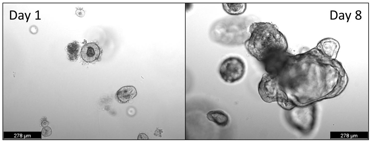 image: Human organoids derived from duodenal tissue sections. Organoids consist of epithelial cells and can be grown from isolated intestinal crypts, which contain active stem cells. Within days, organoids grow from small circular structures into bigger, more complex structures resembling many aspects of intestinal physiology.
