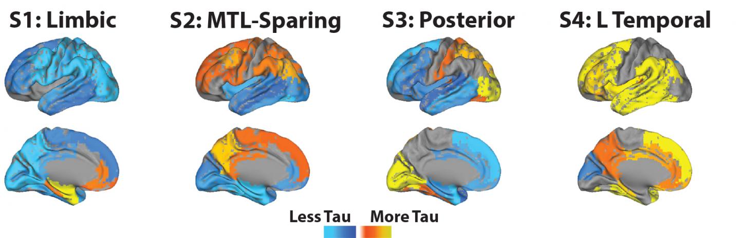 As expected, many individuals did not show any abnormal tau PET signal, and these were therefore automatically assigned to a tau-negative group. By then cross-validating the tau PET images with a sixth independent cohort, and following up the individuals for about two years, the researchers were able to develop four patterns that best represented the data from the remaining individuals. Although the number of subgroups varied in relation to the individuals, all were represented in all cohorts.