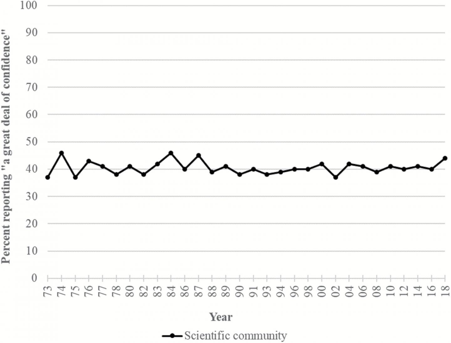 In the 2018 General Social Survey (GSS), about 40 percent of respondents reported a great deal of confidence in the leaders of scientific institutions, a number that has changed little since surveying began in 1973. A majority expressed either a "great deal" or "some" confidence in the scientific community throughout the survey period.