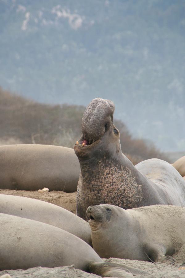 image: Here a male surrounded by his harem is emitting a cry to mark his territory.