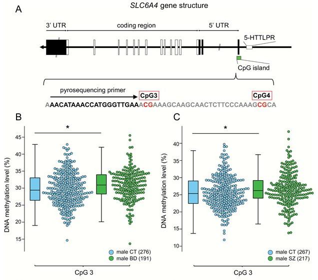 They measured the DNA methylation status of the SERT gene using genomic DNA extracted from the blood of 450 patients with bipolar disorder, 440 patients with schizophrenia, and 460 healthy subjects. They found that the SERT CpG3 site in patients with bipolar disorder and schizophrenia is hypermethylated in male patients. Additionally, after administration of an antipsychotic drug over four weeks, no change in methylation was detected in animal test subjects (marmoset, n=3) compared to control (n=3), which suggests that methylation in bipolar and schizophrenic patients is not affect by medication.