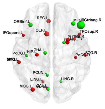 Nodes with differences in the resting-state functional network in early mild cognitive impairment (EMCI) and late mild cognitive impairment (LMCI) groups. Each panel compares betweenness centrality and node efficiency across groups. Red color, values are higher in the EMCI group. Green color, values are higher in the LMCI group.