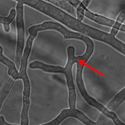 Just like in humans, in fungi, too, fusions between cells are crucial for their development. In the hyphae fungus Sordaria macrospora such fusions (arrow) are required for the production of fruiting bodies during sexual development. The scaffold protein PRO40 is essential for these processes.