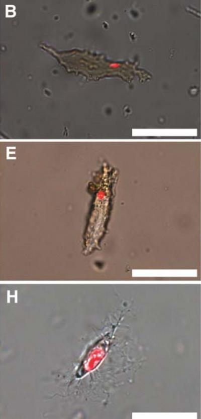 T.rex (B), B. canadensis (E) and ostrich osteocytes (H) showing positive response to propidium iodide, a DNA intercalating dye.