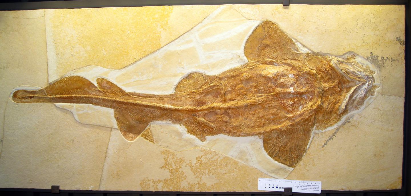 image: A whole skeleton of the fossil shark Palaeocarcharias stromeri (total length approximately 1m) from the Jura Museum Eichstätt.