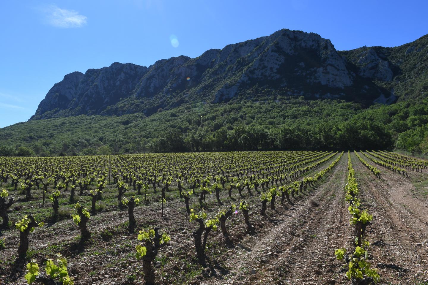 image: A vineyard by Pic Saint Loup Mountain in southern France.