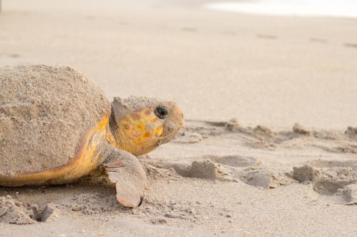 image: A female loggerhead sea turtle nests in the sand in Florida. Photo credit: Gustavo Stahelin/University of Central Florida Marine Turtle Research Group. Permit #: FL MTP-186
