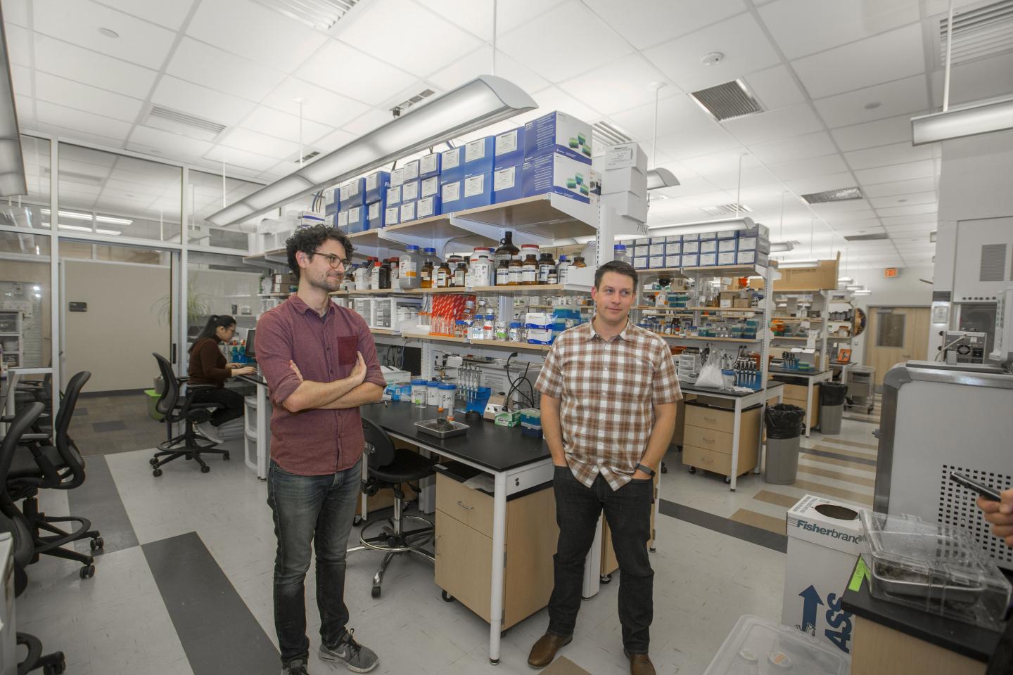 image: UC student Geoffrey Finch, left, and UC biology professor Joshua Benoit talk about their study of Antarctica's only true insect, a wingless fly called Belgica antarctica in a UC biology lab.
