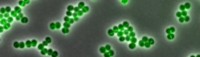 image: Daptomycin binds to certain areas of the cell envelope of the bacterium Staphylococcus aureus, which are particularly vulnerable. The fluorescence-labelled Daptomycin glows green. These are the areas where the cells are currently dividing.