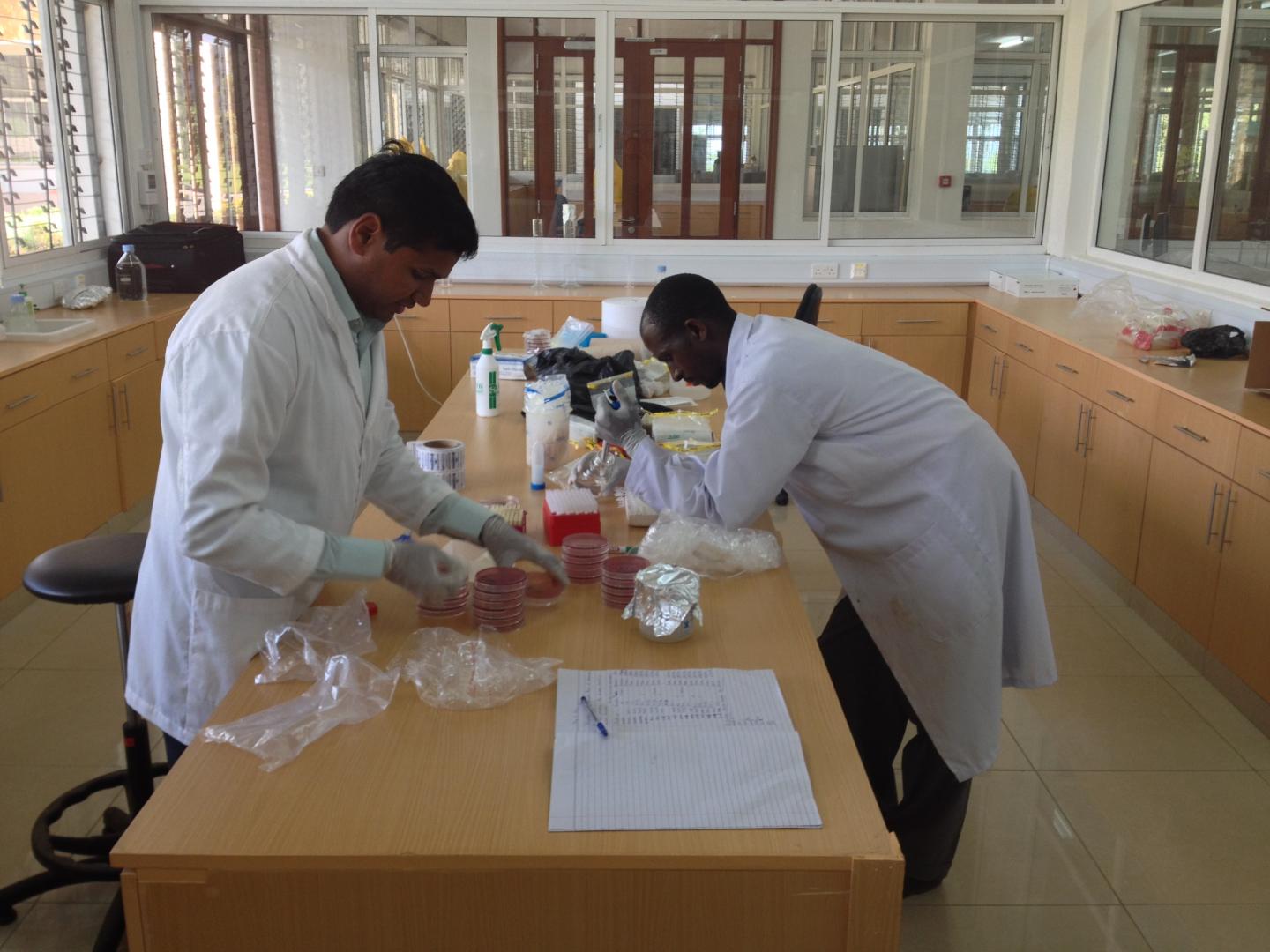 image: Murugan Subbiah (left) and Beatus Lyimo process fecal samples at the Nelson Mandel African Institution of Science and Technology, Arusha, Tanzania.