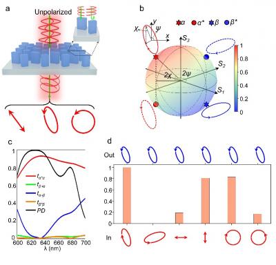 In a new paper in Light Science & Application, a team of scientists, supervised by Prof. Xiangping Li and Zi-Lan Deng from Guangdong Provincial Key Laboratory of Optical Fiber Sensing and Communications, Institute of Photonics Technology, Jinan University, China and co-workers have proposed an effective approach to achieve full Poincaré sphere polarizers in one step by extending circular conversion dichroism (CCD) to arbitrary polarization conversion dichroism (APCD) by means of a monolayer metasurface. By using dimerized meta-molecules composed of a pair of birefringent meta-atoms with properly tailored anisotropic phase responses and relative orientation angles, the collective interference of far-field radiation from those meta-atoms can be controlled to generate APCD. This system is able to preferentially transmit one polarization state that can be located at an arbitrary position on a Poincaré sphere and convert it into transmitted light with flipped handedness while completely blocking the orthogonal polarization state. This APCD metasurface is capable of generating an arbitrarily polarized beam located at an arbitrary position on the Poincaré sphere, irrespective of input polarization, and thus acts as a polarizer that can cover the full Poincaré sphere by design.