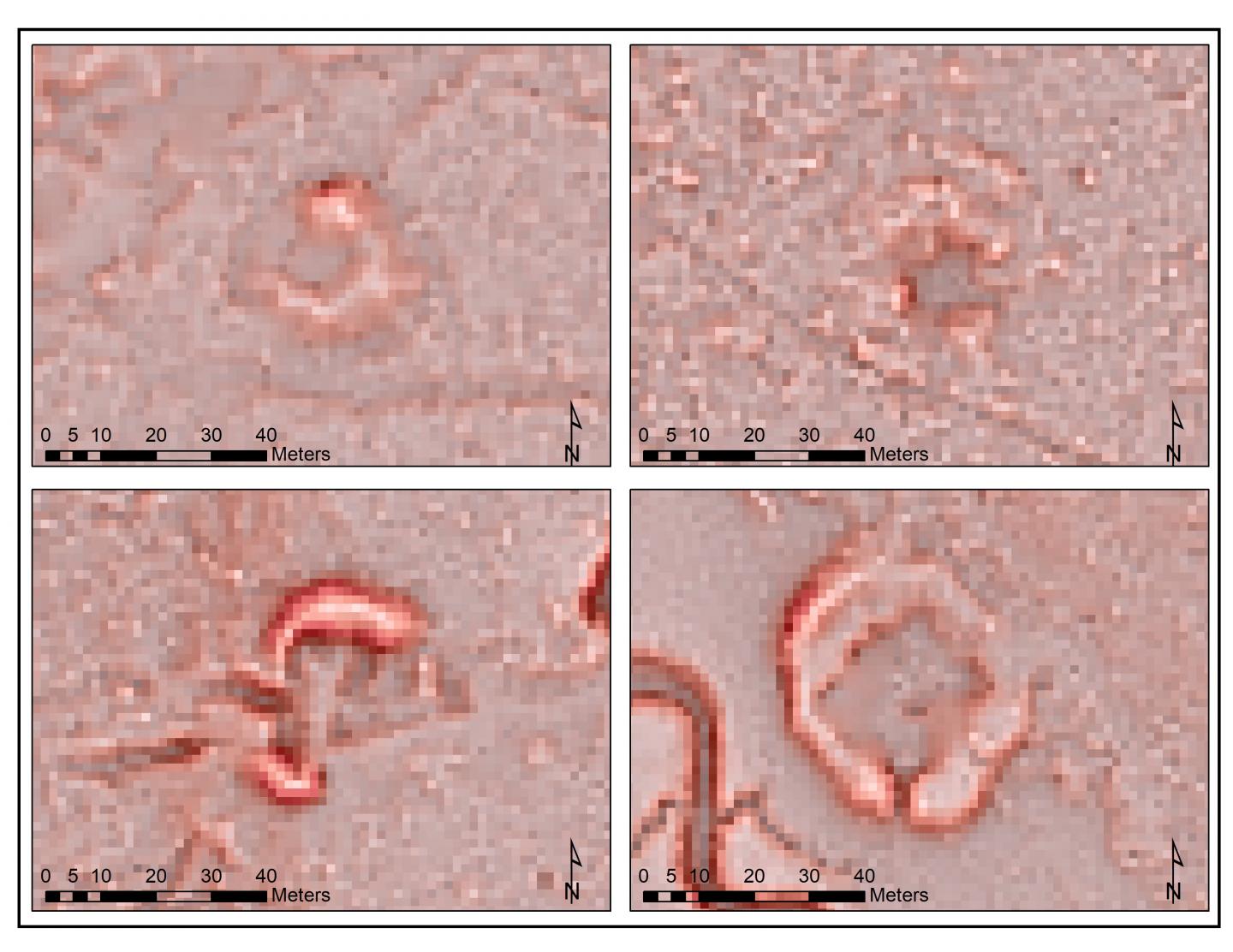 image: Four shell ring features identified using the object-based image analysis (OBIA) algorithm. The ring on the top right has been confirmed as a shell ring site.