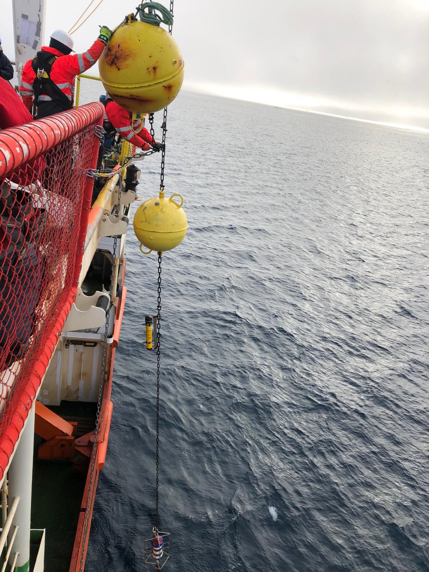 image: Large yellow floats connected to several scientific sensors are lowered over the edge of a ship in the Arctic Ocean.