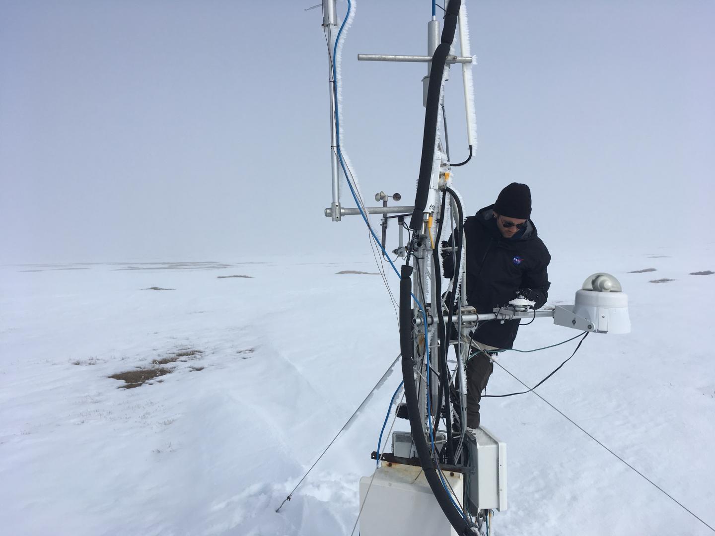 image: Ecosystem ecologist and post-doctoral fellow Kyle Arndt checking on the measurement equipment set up by SDSU in Utqiagvik (formerly Barrow), Alaska. New research finds that water from spring snowmelt infiltrates the soil and triggers fresh carbon dioxide production at higher rates than previously assumed.