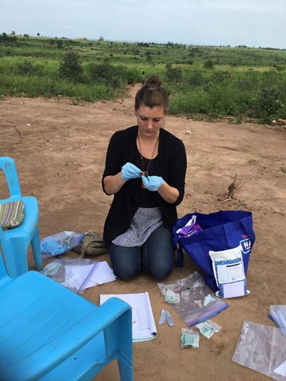image: Bree Dell, DVM and Ph.D. candidate with the University of Tennessee College of Veterinary Medicine, excises bushmeat tissue in the field for preservation and subsequent genetic analysis to identify the species of bushmeat and assess viral and bacterial microbial diversity.