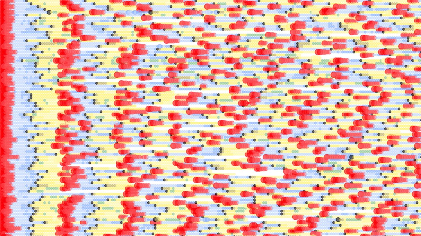 image: Visualizing the data from the modelling part of the study. Each line is a user, each dot is a day. The dot colors are inferred biological states; Red dots are the menses; black dots are the most likely day of ovulation; blue dots are the follicular phase days; yellow dots are the luteal phase days.