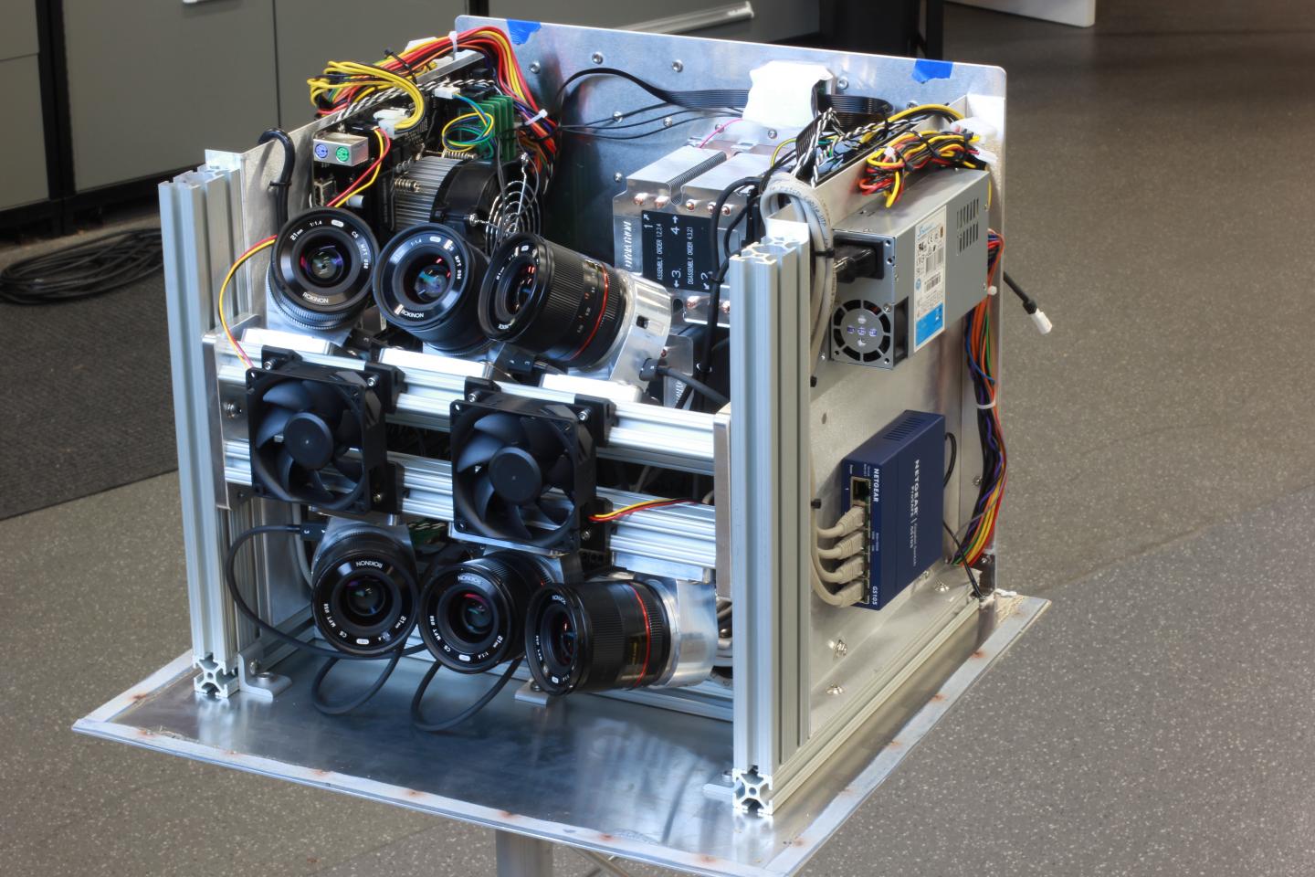 image: Each of the 16 tracking pod includes six cameras with overlapping fields of view.