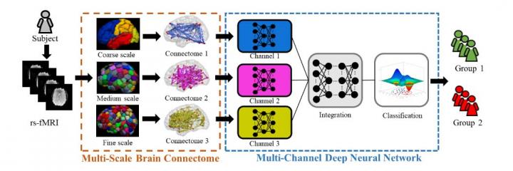 image: Schematic diagram of the proposed multichannel deep neural network model analyzing multiscale functional brain connectome for a classification task. rsfMRI = resting-state functional MRI.