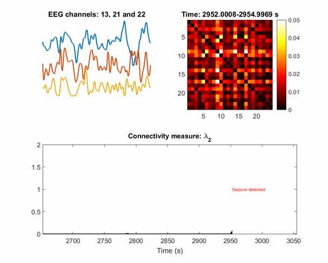 image: This gif was recorded during two seizures, one at 2950 seconds, the other at 9200. The top left animation is of EEG signals from three electrodes. The top right is a map of the inferred network. The third animation plots the Fiedler eigenvalue, the single value used to detect seizures using the network inference technique.