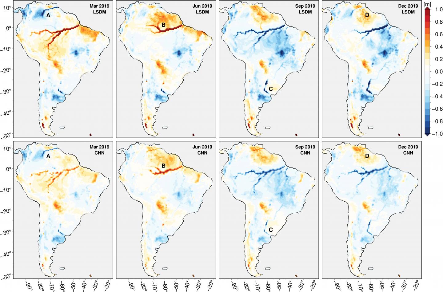 Now the research team around primary author Christopher Irrgang developed a new method in order to draw conclusions on the stored water quantities of the South American continent from the coarsely-resolved satellite data. "For the so called down-scaling, we are using a convolutional neural network, in short CNN, in connection with a newly developed training method", Irrgang says. "CNNs are particularly well suited for processing spatial Earth observations, because they can reliably extract recurrent patterns such as lines, edges or more complex shapes and characteristics."