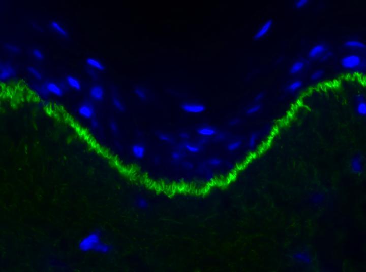 image: This picture of a microscopic slide shows the U-shaped pattern (in green) visible in the skin biopsy of an epidermolysis bullosa acquisita patient.