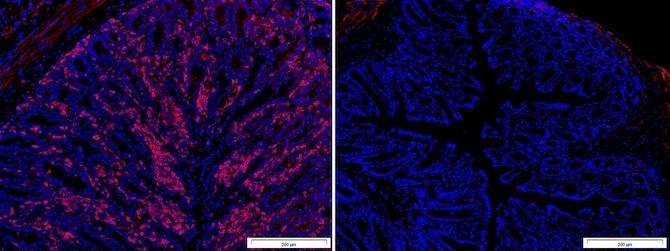 image: In colitis, an infiltration of activated T cells (shown in red on the left) is clearly visible in the colon. By blocking the BH4 pathway (shown at right), the researchers were able to deeply suppress T cell function.
