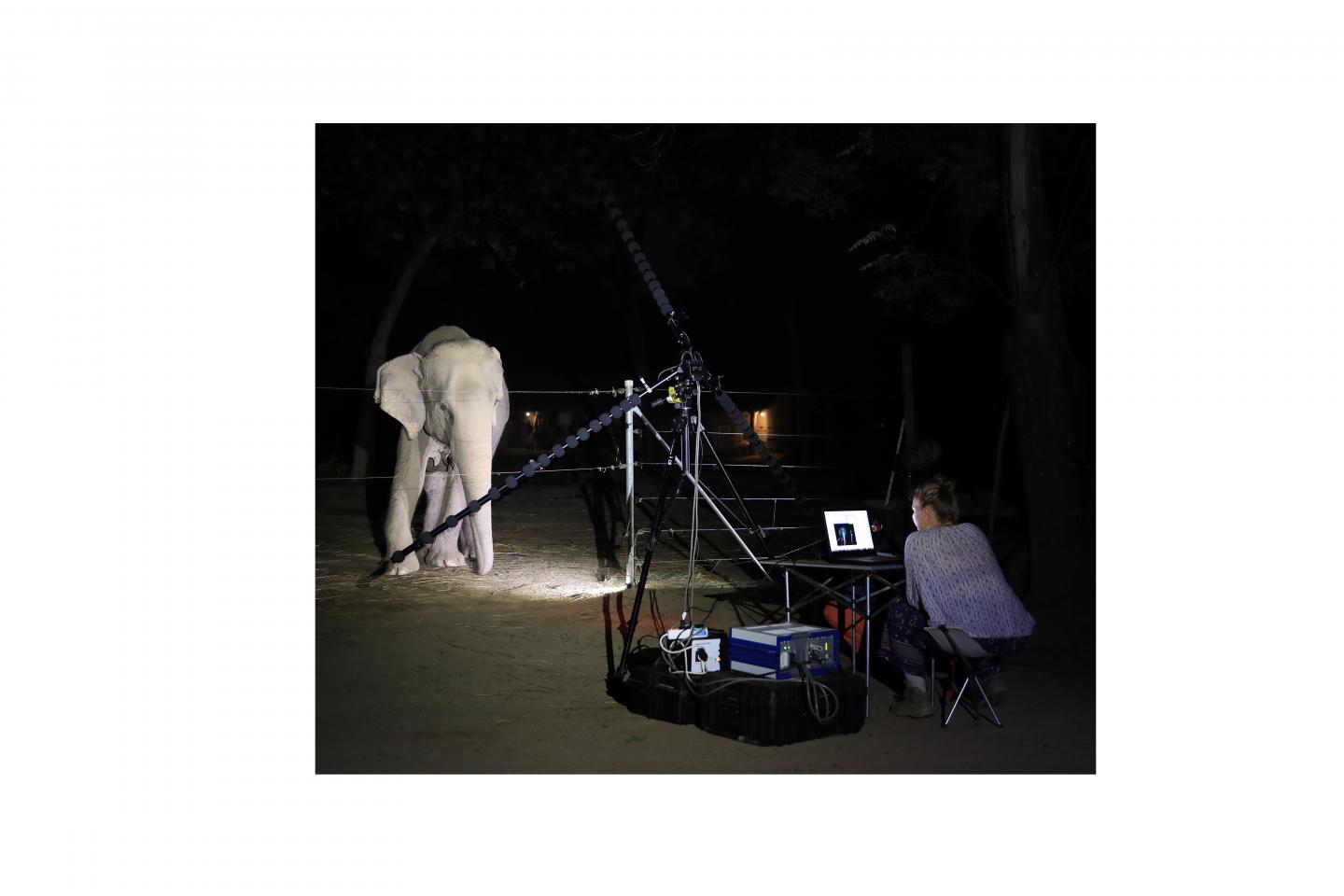 image: With the acoustic camera´s star-shaped array of microphones placed in front of the elephant the researchers are waiting patiently for her to vocalize while night falls.