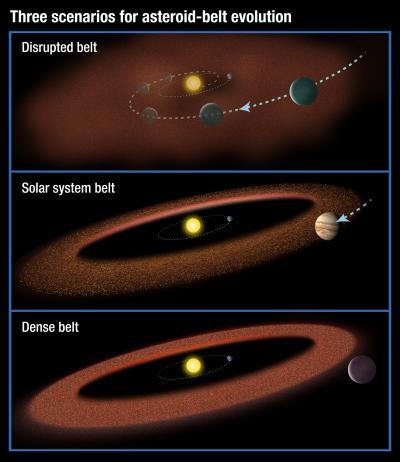 This illustration shows three possible scenarios for the evolution of asteroid belts. In the top panel, a Jupiter-size planet migrates through the asteroid belt, scattering material and inhibiting the formation of life on planets. The second scenario shows our solar-system model: a Jupiter-size planet that moves slightly inward but is just outside the asteroid belt. In the third illustration, a large planet does not migrate at all, creating a massive asteroid belt. Material from the hefty asteroid belt would bombard planets, possibly preventing life from evolving.