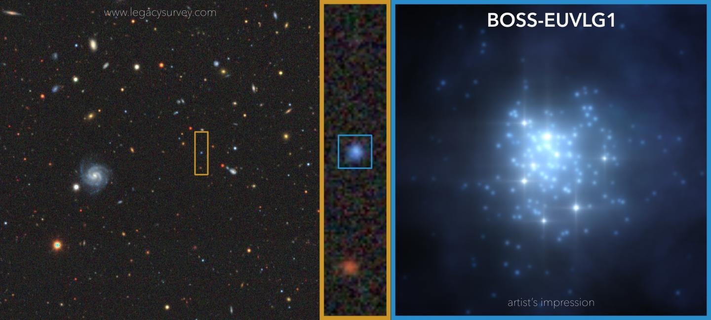 image: Photo caption: Left and centre: Image of the region of the sky containing BOSS-EUVLG1, which stands out due to its blue colour. Credit: DESI Legacy Imaging Surveys. Right: Artist`s drawing of the burst of star formation in BOSS-EUVLG1, which contains a large number of young massive stars, and hardly any dust. Credit: Gabriel Pérez Díaz, SMM (IAC).
