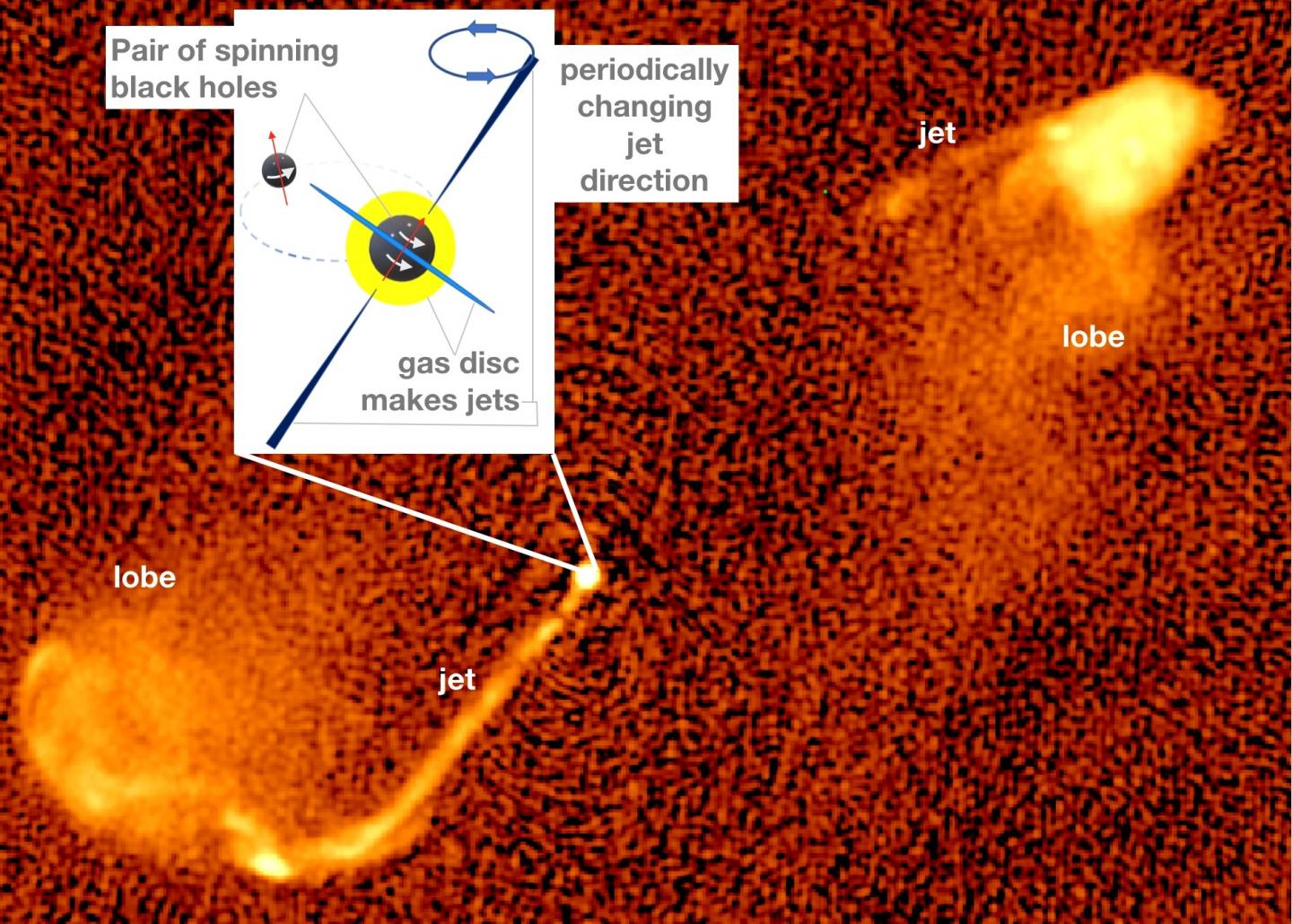 image: Jets from double black holes change direction continuously. The effect can explain features in this 5 GHz radio map of 3C 334 and many powerful radio sources in the sky. The jet emanates from the nucleus of a galaxy (its stars are not visible at radio frequencies) about 10 billion light years from our own. The image spans five million light years from left to right. The peculiar structure of the jets signifies a periodic change of the direction of the jet (precession), an effect that is predicted for jets from black hole pairs. The inset diagram schematically illustrates the physical processes in the black hole pair. Jets may form in gas discs around black holes. The direction of the jets is tied to the spin of the black hole. The spin axis is shown as a red arrow. The latter changes direction periodically due to the presence of the second black hole.