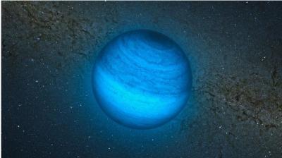 This artist's impression shows the free-floating planet CFBDSIR J214947.2-040308.9. This is the closest such object to the Solar System. It does not orbit a star and hence does not shine by reflected light; the faint glow it emits can only be detected in infrared light. Here we see an artists impression of an infrared view of the object with an image of the central parts of the Milky Way from the VISTA infrared survey telescope in the background. The object appears blueish in this near-infrared view because much of the light at longer infrared wavelengths is absorbed by methane and other molecules in the planet's atmosphere. In visible light the object is so cool that it would only shine dimly with a deep red colour when seen close-up.