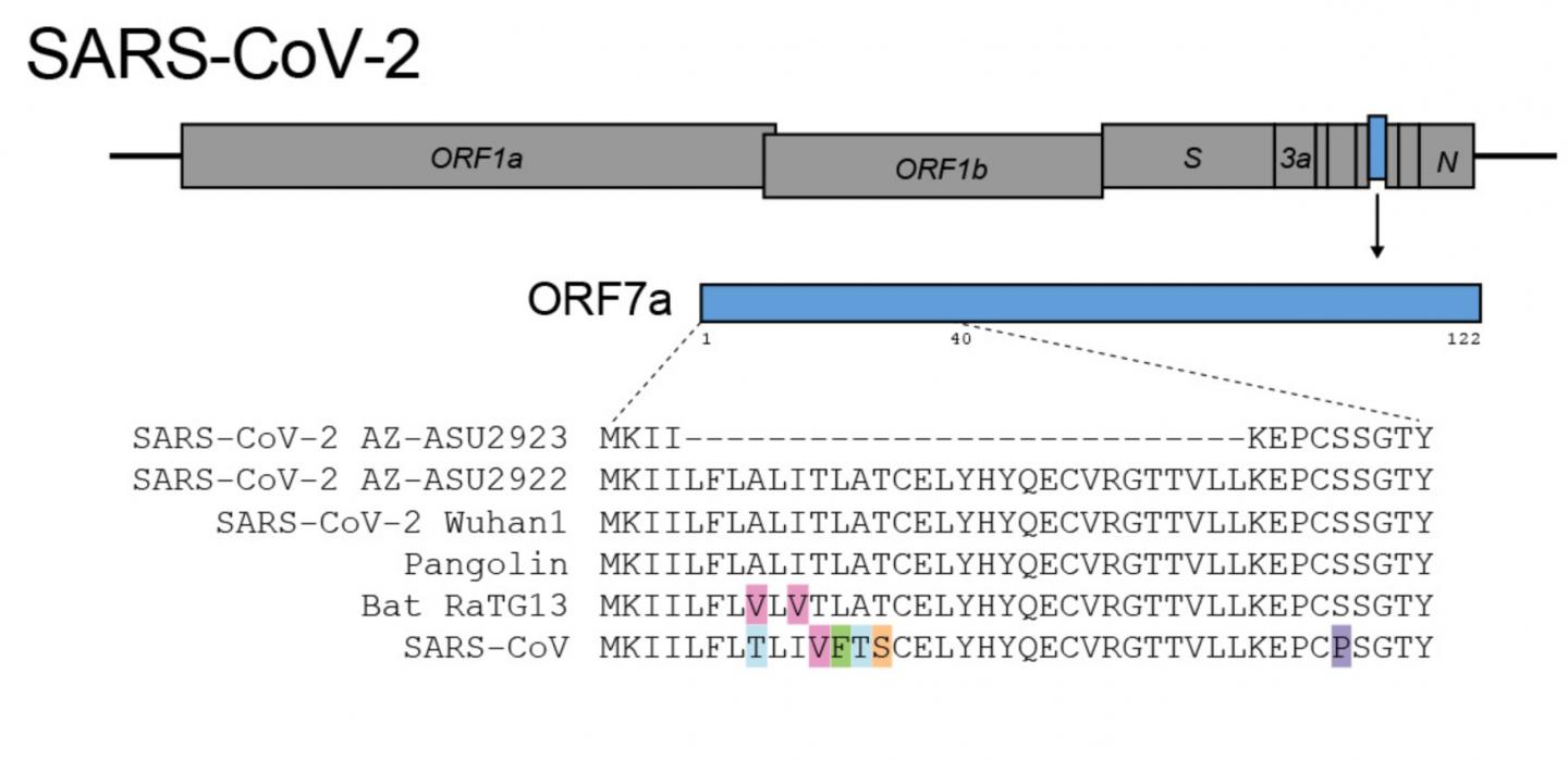 image: A genome deletion removes 27 protein building blocks, called amino acids, from the SARS-CoV-2 accessory protein ORF7a. The protein is very similar to the 2003 SARS-CoV immune antagonist ORF7a/X4.