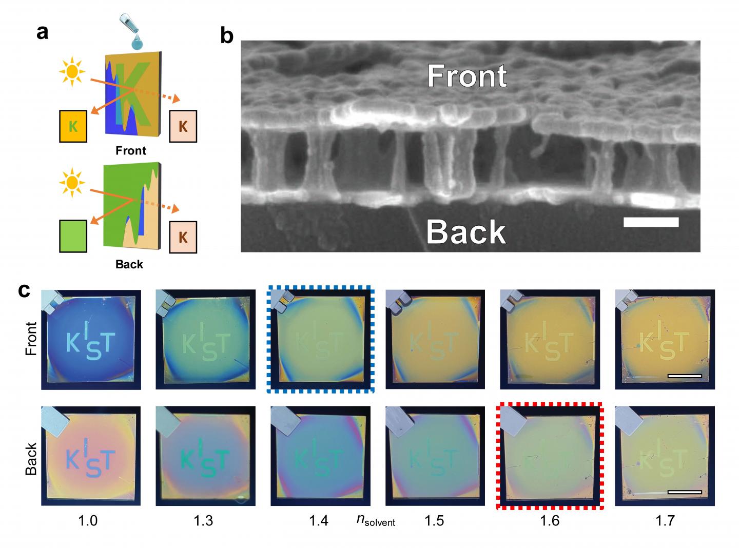 In a new paper published in Light Science & Applications, a team of scientists, led by senior researcher Yong-Sang Ryu (Sensor System Research Center, Korea Institute of Science and Technology, Republic of Korea) & Professor Seung-Yeol Lee (School of Electronics Engineering, Kyungpook National University, Republic of Korea) and co-workers developed a liquid-permeable translucent mirror to achieve asymmetric reflective colour contrast depending on the viewing direction. Based on the simple and cost-effective metal-dielectric-metal (MDM) films, they designed an optical device which is capable of displaying distinct colours as well as messages with respect to the viewing directions. This optical device is comprised nanoscale air voids in the dielectric film space which plays a key role in colour tuning via an infiltration of exposed liquids into the optical hotspots. Because the physicochemical properties of the dielectric films lead colour creations in visible ranges, based on the thorough understandings of optical phenomena depending on the comprising nanostructures of MDM films, reflective colour tuning in varying refractive index of surrounding solvents were realized. These scientists summarize the optical properties of their device: