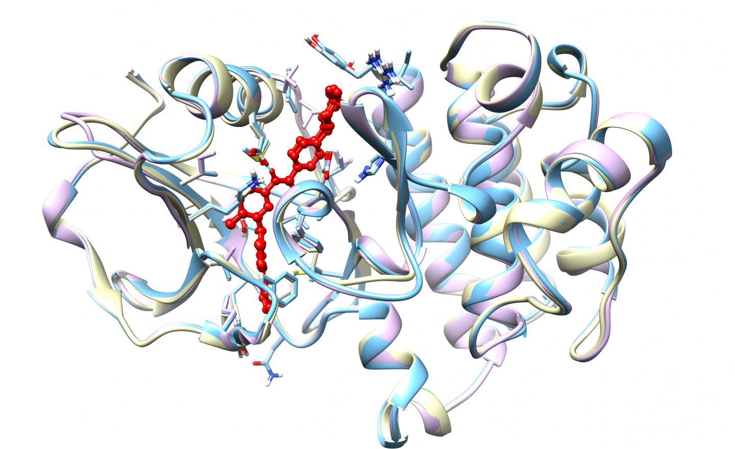 image: Masitinib (colored in red) binds and inhibits the activity of LYN (pink), FYN (blue) and BLK (yellow).